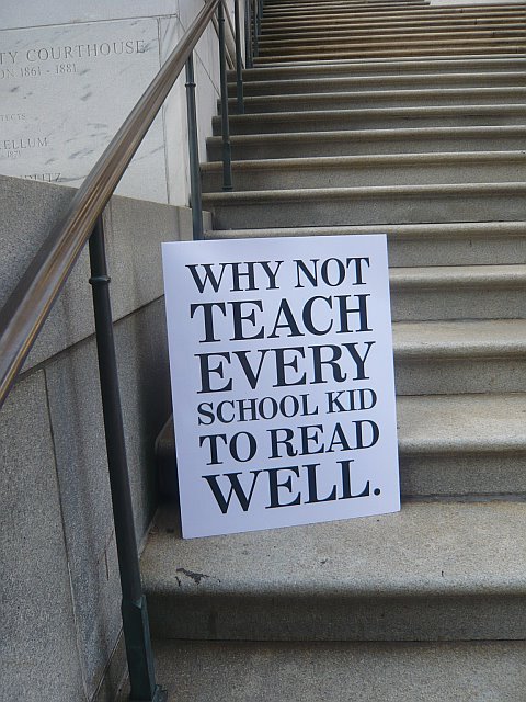 A teacherish-preacherish-looking guy in a crew-neck sweater and a reddish beard came by my sign this morning and went off on the school system. You can rant in cities more easily than in small towns. The thrum of traffic and ambient city noise lets you make your own noise without standing out like a lone streaker at a suburban high school football game. He stared at me while he went off. But he was speaking to the cosmos. He was there in front of me for maybe 90 seconds but that was time enough for him to make his points. I nodded in agreement on a couple points. But I did as I’ve learned to do with guys like him, I pointed at my sign.